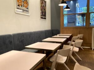 椅子座り心地よい、テーブル広い、隣との間隔普通
