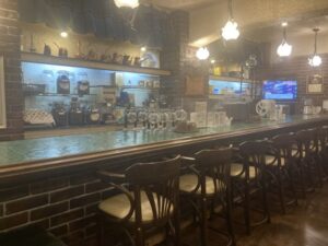 どこか中世を感じさせるような室内なのに壁には本物のレンガと色鮮やかなブルーの瓦屋根が目を惹きます